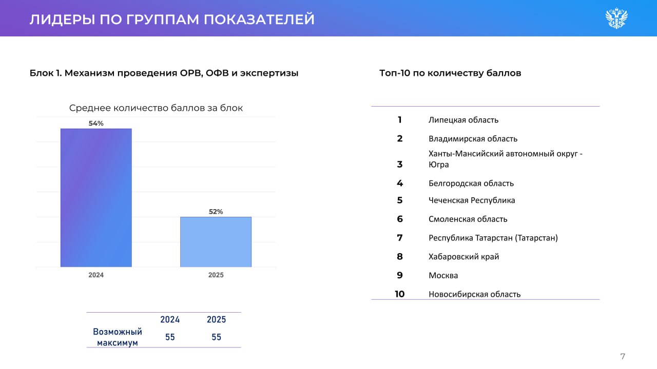 Отдельно регион отмечен в блоке «Механизм проведения процедур института ОРВ» — за системную работу по анализу нормативноправовых актов.