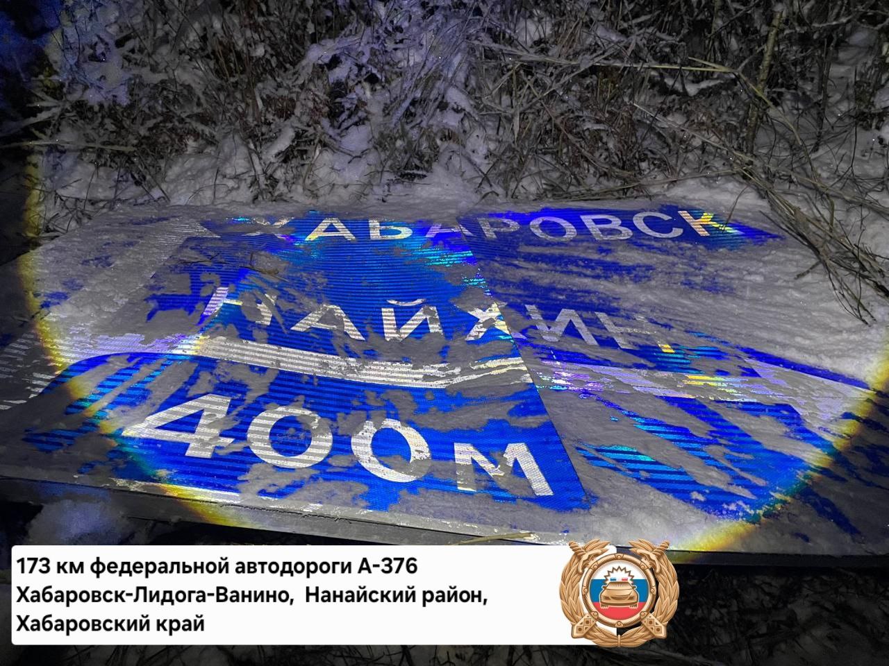 По уточненным данным сегодня в 15:30 в районе 173 км федеральной автодороги А-376 Хабаровск-Лидога-Ванино водитель Mercedes-Benz, мужчина 1975 г.р, двигаясь со стороны г. Хабаровска в сторону с. Лидога Нанайского района не обеспечил постоянный контроль за движением, не учёл дорожные и погодные условия в результате чего допустил наезд на информационный дорожный знак 6.9.1 "Предварительный указатель направлений" с последующим съездом в левый кювет по ходу движения.