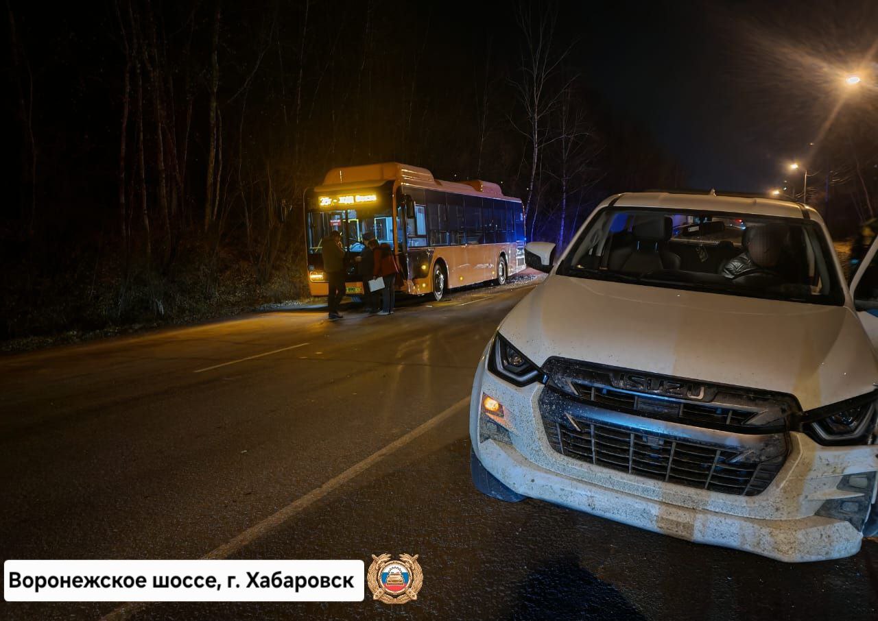 По предварительным данным сегодня в 22:00 на Воронежском шоссе г. Хабаровска водитель автомобиля Исудзу, не выдержав безопасную дистанцию, совершил столкновение с автомобилем БМВ. В месте столкновения находился также автомобиль Тойота Приус, возле которого стояли его водитель и пассажир. Водитель маршрутного автобуса, который двигался по Воронежскому шоссе, не выдержал безопасную дистанцию и совершил столкновение с Тойотой Приус, с последующим наездом на стоящих водителя и пассажира Приуса.