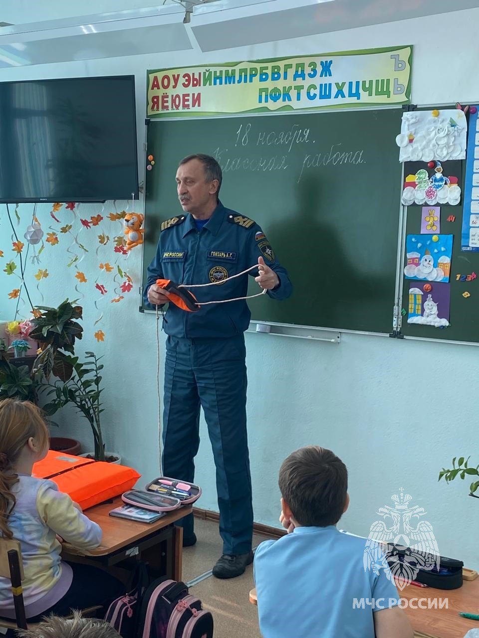 Ребята узнали, как правильно оценить состояние зимнего покрова, какие признаки говорят о его непрочности, и почему категорически запрещено выходить на лёд в местах, где установлены запрещающие знаки. Вместе с сотрудником МЧС России ученики выучили алгоритм действий, если провалился в воду, а также способы вызова и оказания помощи. Наглядными пособиями на уроке стали спасательный жилет и «конец Александрова». Дети смогли попробовать сами использовать подручные средства для спасения.