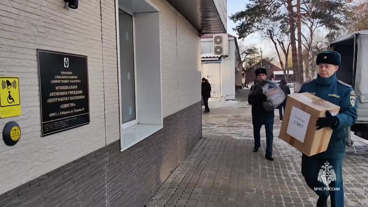 В День Героев Отечества сотрудники Главного управления МЧС России по Хабаровскому краю доставили в Центр работы с населением «Единство» краевого центра гуманитарную помощь.