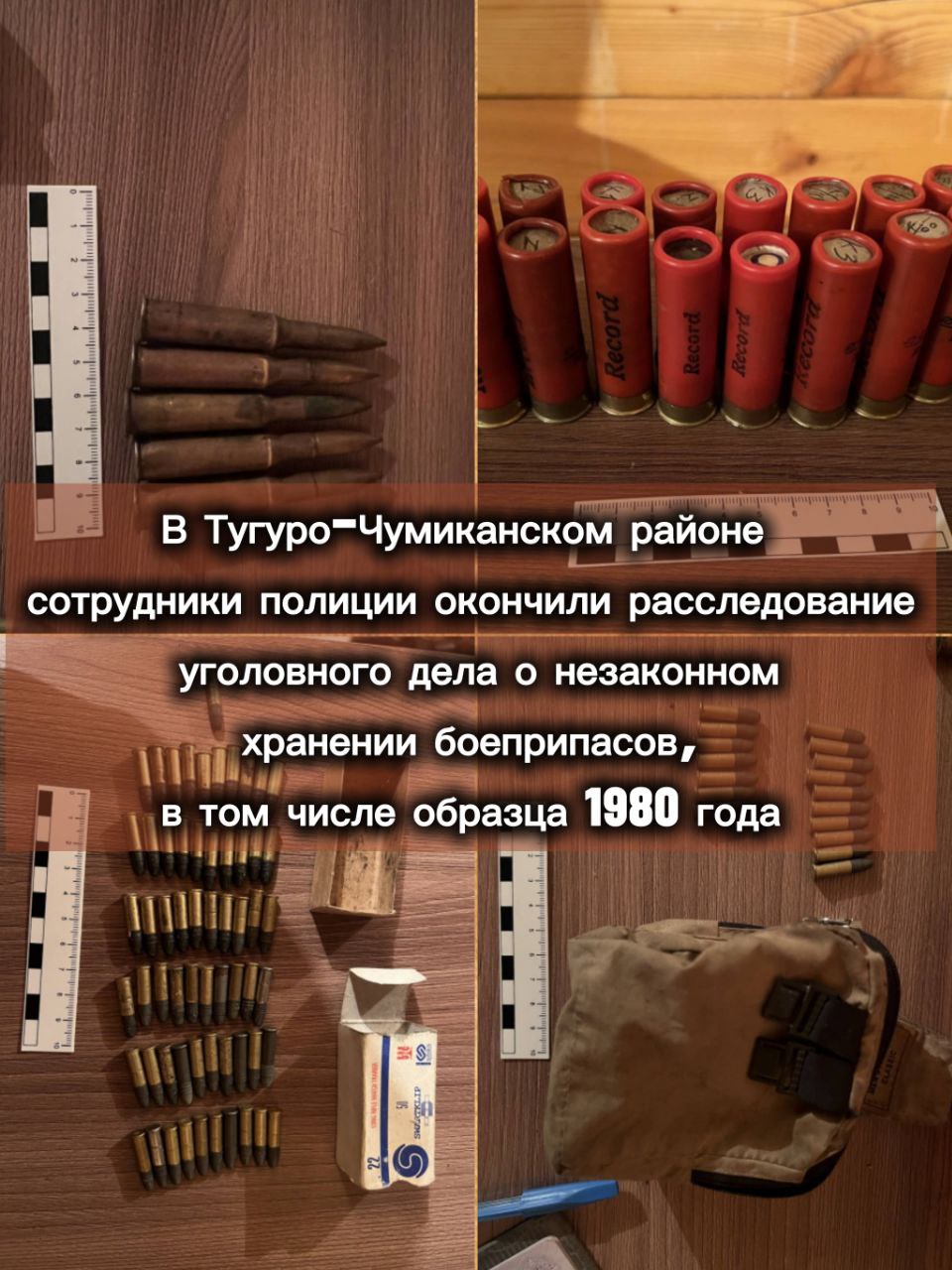 48-летний обвиняемый пояснил, что в ноябре текущего года указанные боеприпасы он нашел в зимовье, расположенном на охотничьем участке в 5 километрах от села Тугур.В настоящее время расследование уголовного дела по ч.1 ст. 222 УК РФ окончено.
