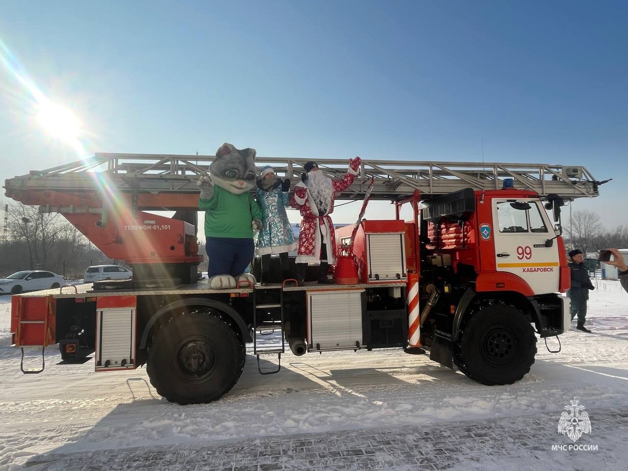 В Хабаровске пожарные МЧС России приняли участие в поздравлении ребят, находящихся на лечении в краевой детской больнице. Акция была организована молодежной волонтерской организацией. На пожарной автолестнице 99 пожарно-спасательной части МЧС России разместились Дед Мороз и Снегурочка, ростовая кукла кота.