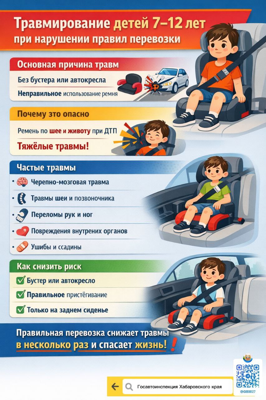 Дети в возрасте от 7 до 12 лет нередко получают травмы в дорожно-транспортных происшествиях из-за нарушений правил их перевозки. Наиболее частые причины — отсутствие детских удерживающих устройств, использование неподходящего автокресла или бустера, а также неправильное пристёгивание ремнём безопасности.