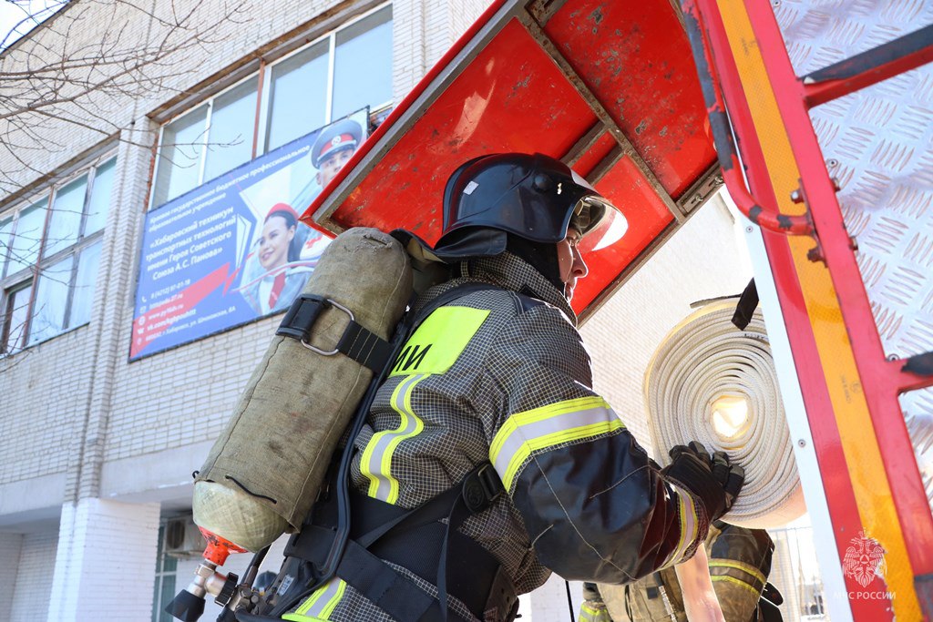В Хабаровском техникуме транспортных технологий имени героя Советского союза А.С. Панова сотрудники пожарно-спасательного гарнизона краевого центра провели учение