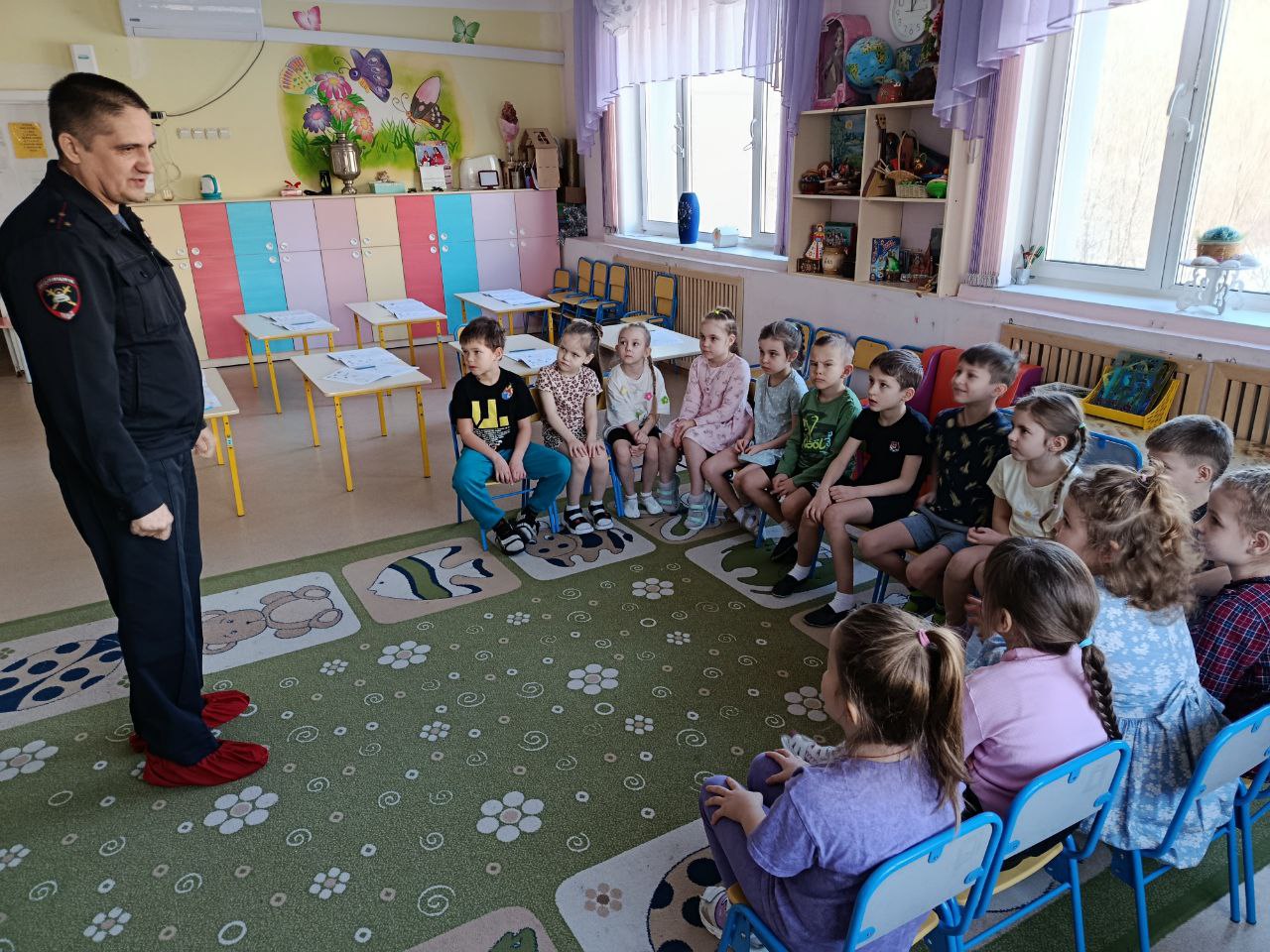 Сегодня дорожный полицейский провел беседу с воспитанниками МАДОУ "детский сад N 36 "Радуга" г. Хабаровска. В ходе проведения беседы сотрудник рассказал дошкольникам, как правильно себя вести во дворе во время прогулок.Инспектор также напомнил детям о Правилах перехода проезжей части, напомнил о сигналах светофора, обьяснил для чего важно убедиться в безопасности при переходе дороги. Полицейский разъяснил, что в темное время суток или в условиях плохой видимости важно использовать световозвращающие элементы.Уважаемые родители помните, что лучшее воспитание детей-это собственные положительные примеры