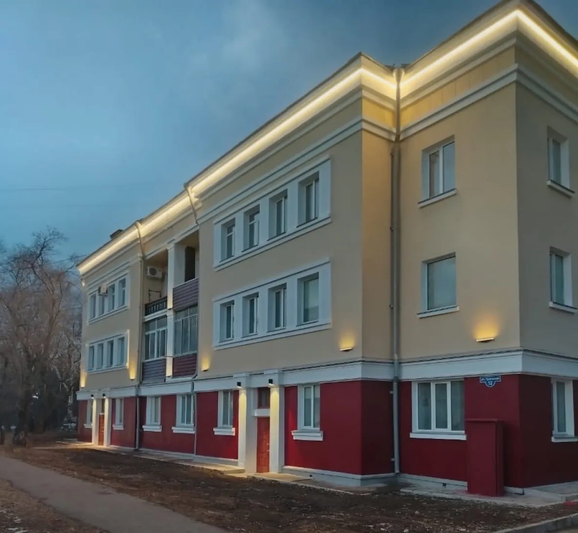 В Комсомольске-на-Амуре провели реставрацию фасада исторического дома №12 по улице Уральской – подрядчик не только привёл в порядок внешний вид здания, но и смонтировал архитектурную подсветку.