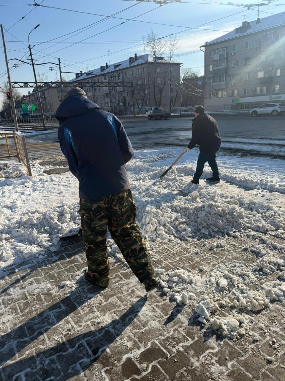 Силами комитета по управлению Индустриальным районом организованны работы по очистке пешеходных связей от снега в районе пересечения улиц Краснореченская — Калараша.