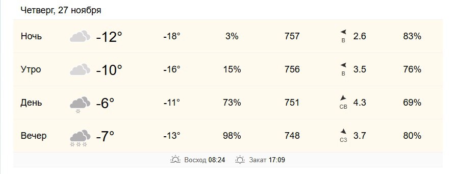 Ветер северо-восточный, около 4 м/с. Пасмурно, вечером снег.