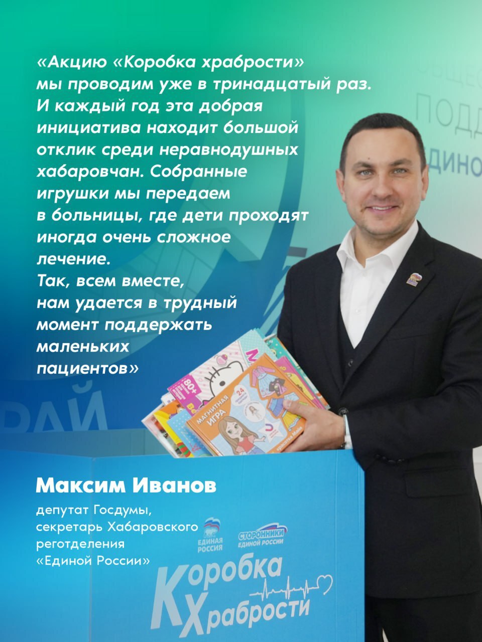 Как подчеркнул депутат Госдумы, секретарь Хабаровского реготделения «Единой России» Максим Иванов, акция находит большой отклик и помогает поддерживать маленьких пациентов.