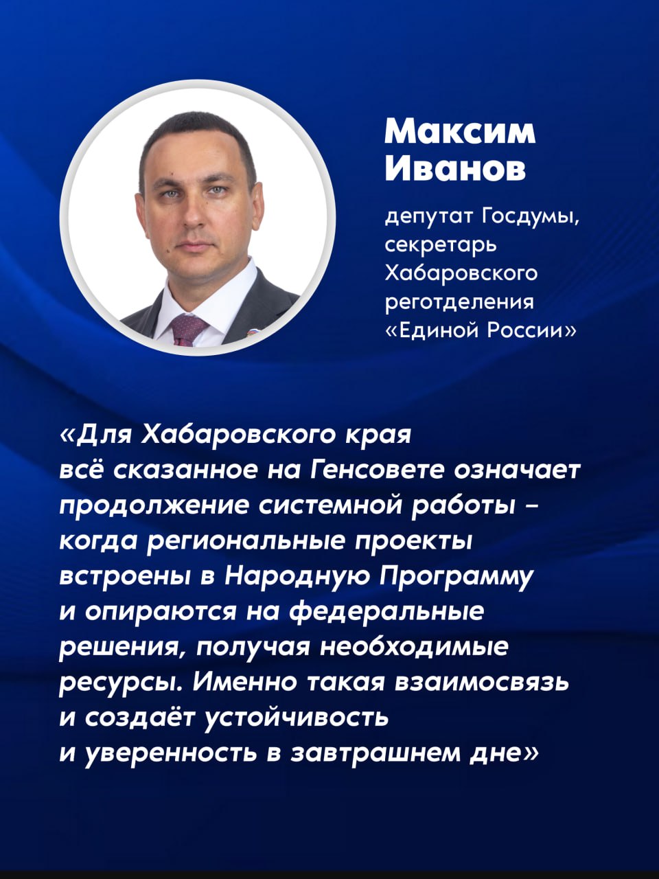 12 декабря в Москве на заседании Генсовета «Единой России» подведены итоги работы в 2025 году и обозначены планы на 2026 год. От Хабаровского края участие приняли секретарь Хабаровского реготделения партии, депутат Госдумы Максим Иванов и депутат Законодательной Думы Хабаровского края Всеволод Мохирев.