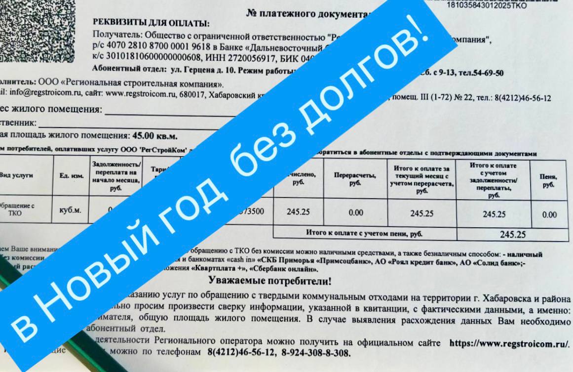 Компания спишет пени за несвоевременные платежи за услугу по обращению с твердыми коммунальными отходами за 2025 год жителям Хабаровска и района им. Лазо Хабаровского края, которые полностью погасят задолженность, сформировавшуюся на 01.12.2025г., и оплатят начисления за декабрь 2025 года, отраженные в платежном документе, полученном в январе 2026 года.