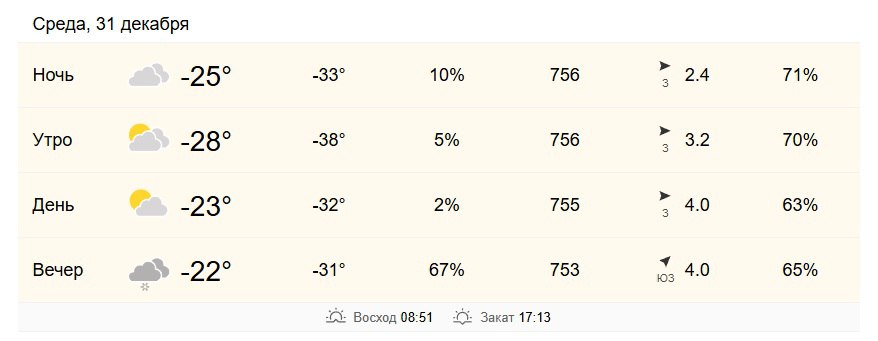 31 декабря нас ждет морозный, но ясный день с переменной облачностью. Днем температура воздуха поднимется до -19°, а ночью опустится до -26°. Легкий бриз (до 8 м/с) добавит свежести.А ближе к волшебному часу ожидается короткий, но, возможно...