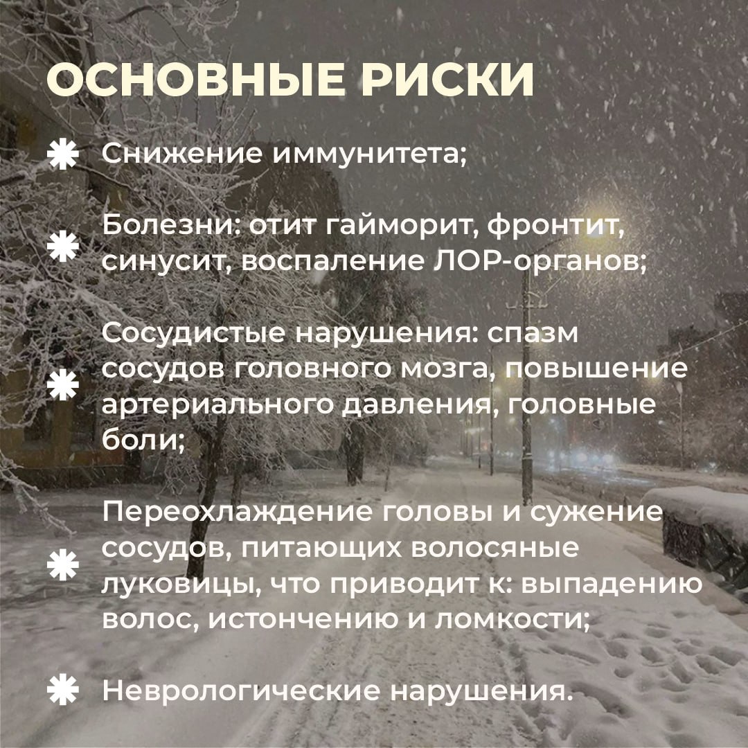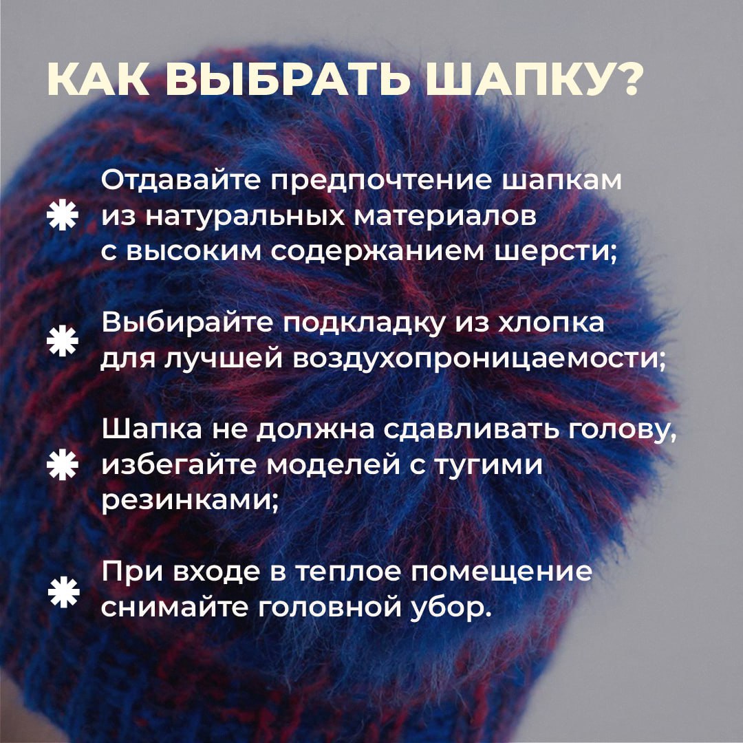 Об этом и том, как избежать рисков для здоровья и выбрать правильно головной убор, – смотрите в карточках.