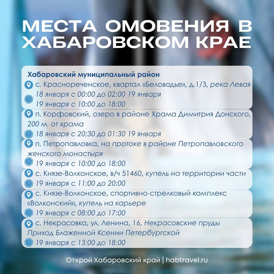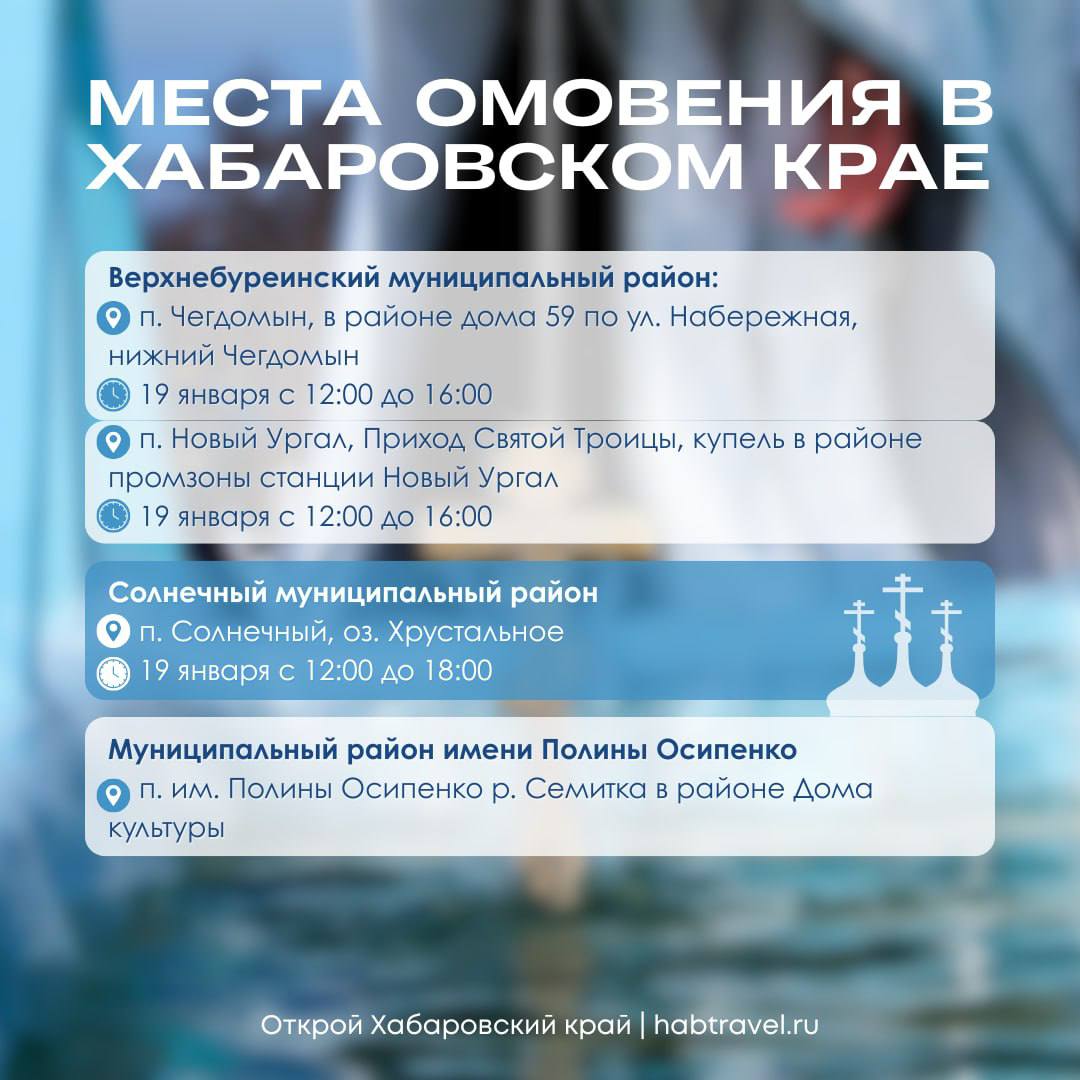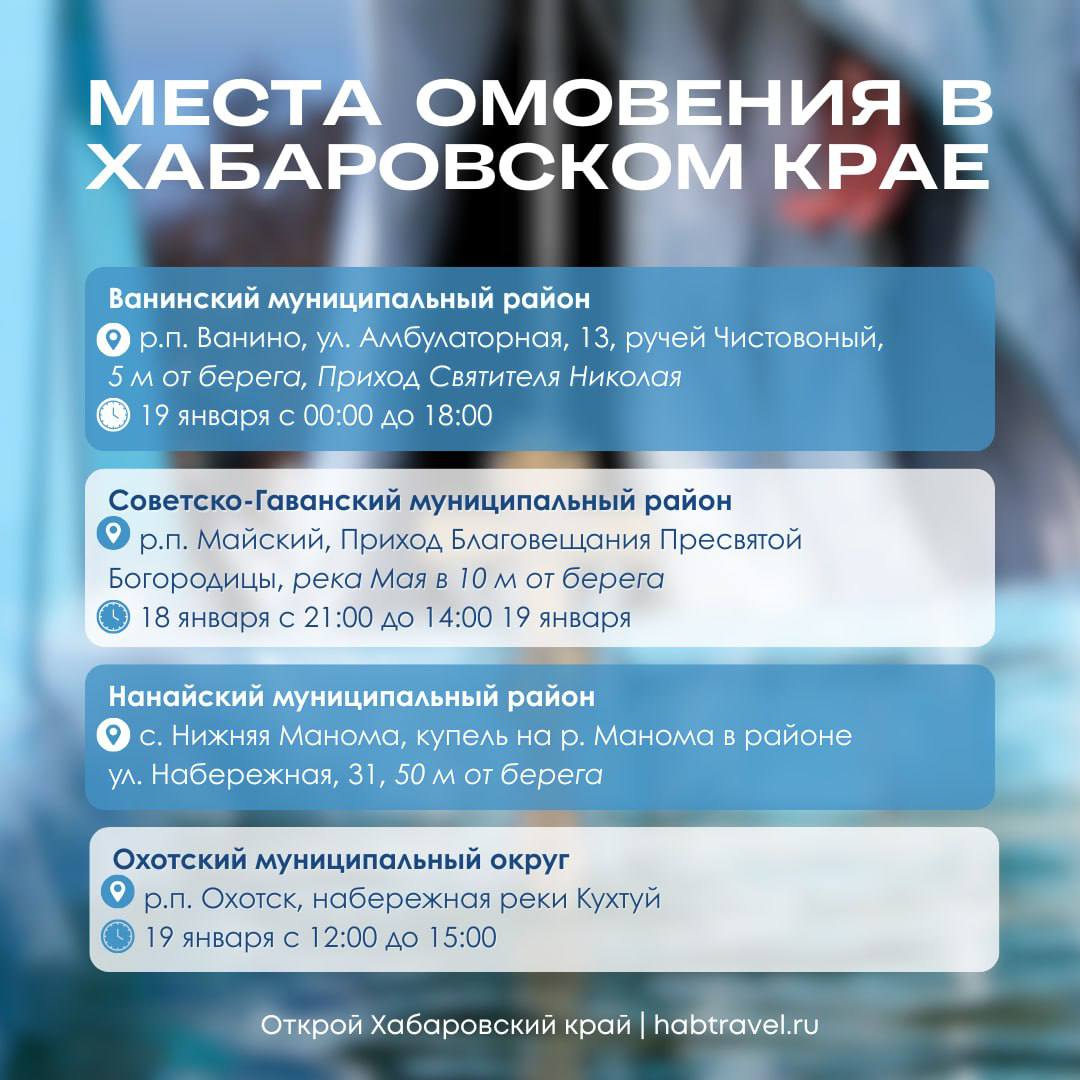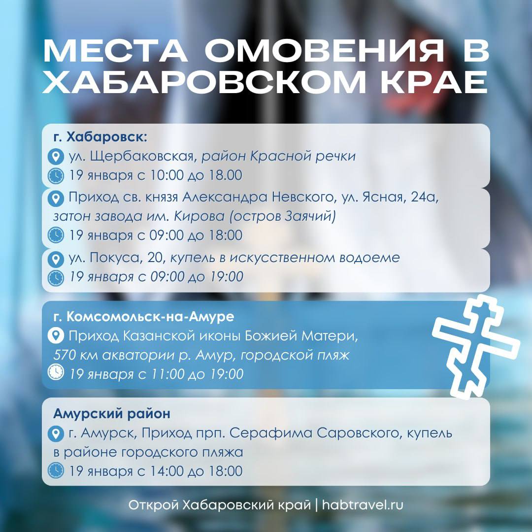 Адреса и время подхода к купелям – в карточках Туристского информационного центра Хабаровского края (в Амурске крещенские купания отменены из-за слишком тонкого льда).