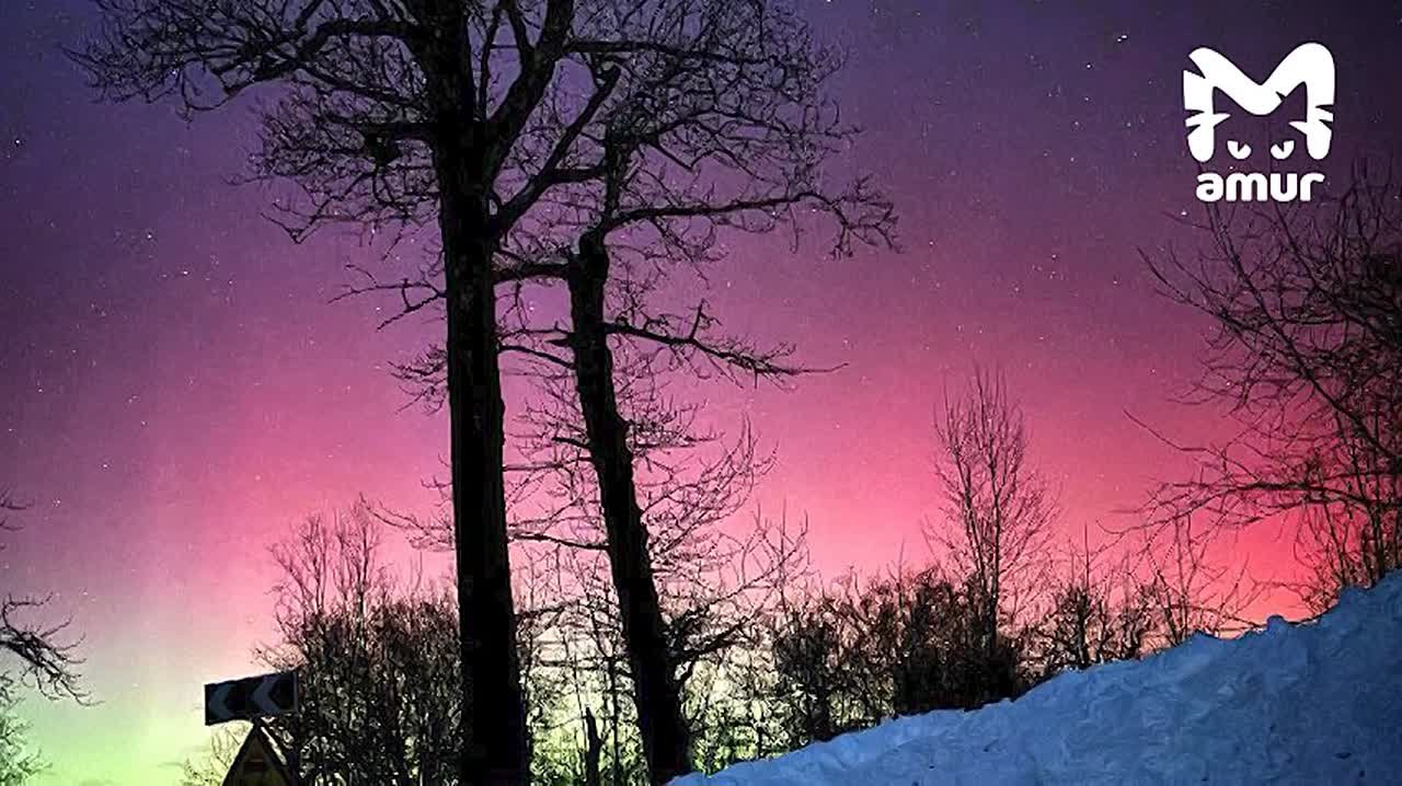 Роскошное полярное сияние озарило небо над Дальним Востоком. Зелёно-красные огни видели даже из самолёта.