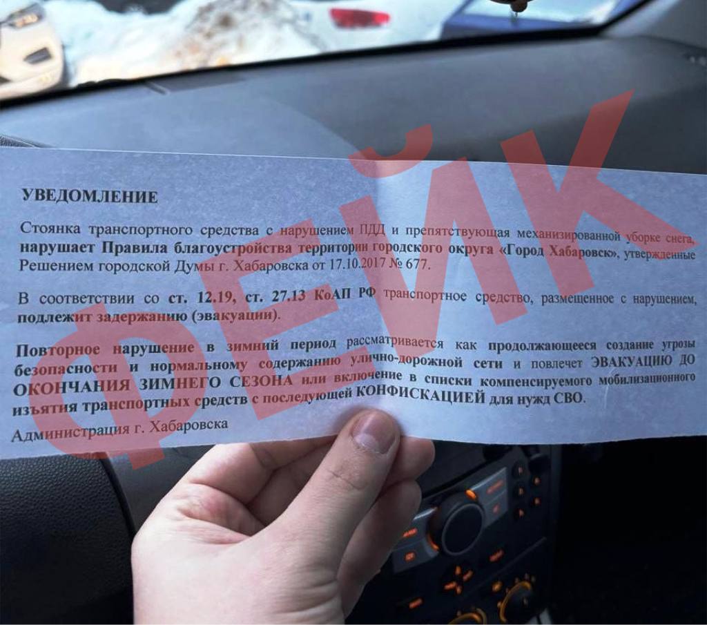 Фейк: в сети распространяется информация о том, что администрация города Хабаровска совместно с сотрудниками ГИБДД при выполнении работ по очистке автомобильных дорог якобы планирует применять меры по изъятию автомобилей у граждан, нарушивших правила парковки, с последующей передачей для нужд зоны СВО. Утверждается, что соответствующее письмо с таким предложением якобы направил мэр Хабаровска Сергей Кравчук начальнику УМВД России по г. Хабаровску.