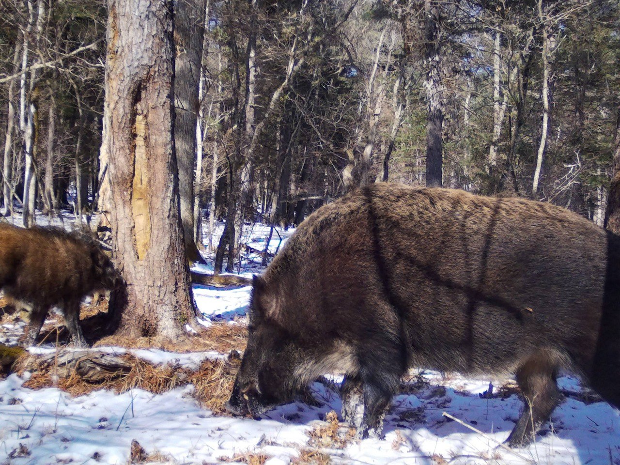 В Лазовском заповеднике в Приморском крае крупный кабанчик влез в кадр, перекрыв фотоловушке обзор на остальную часть табуна – кадром поделился центр «Амурский тигр».