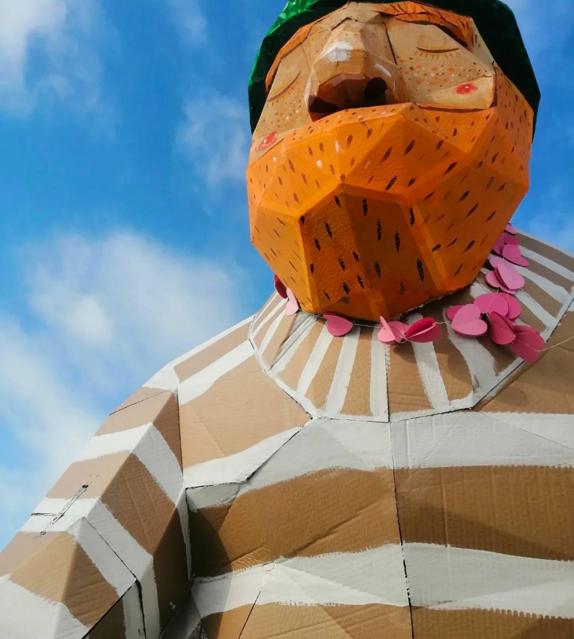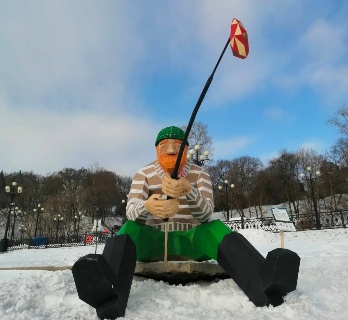 Высота рыбака – 3,2 метра. Выполнен он из гофрокартона. Приходите фотографироваться!
