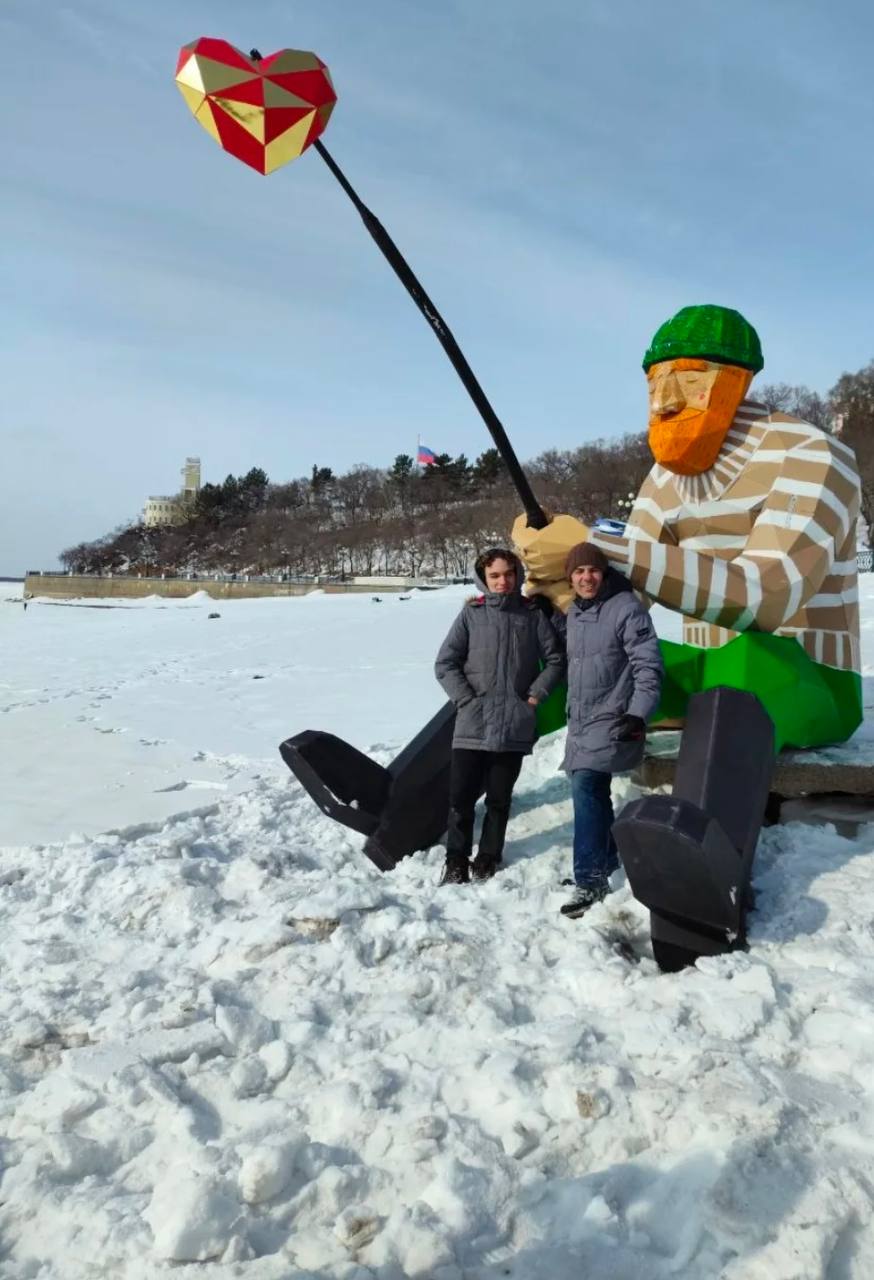 Инсталляция в виде рыбака с уловом из сердца возвели в рамках выставки «Наречие-2026». Создали арт-объект творцы Костя Гофрокот и Катя Генова.