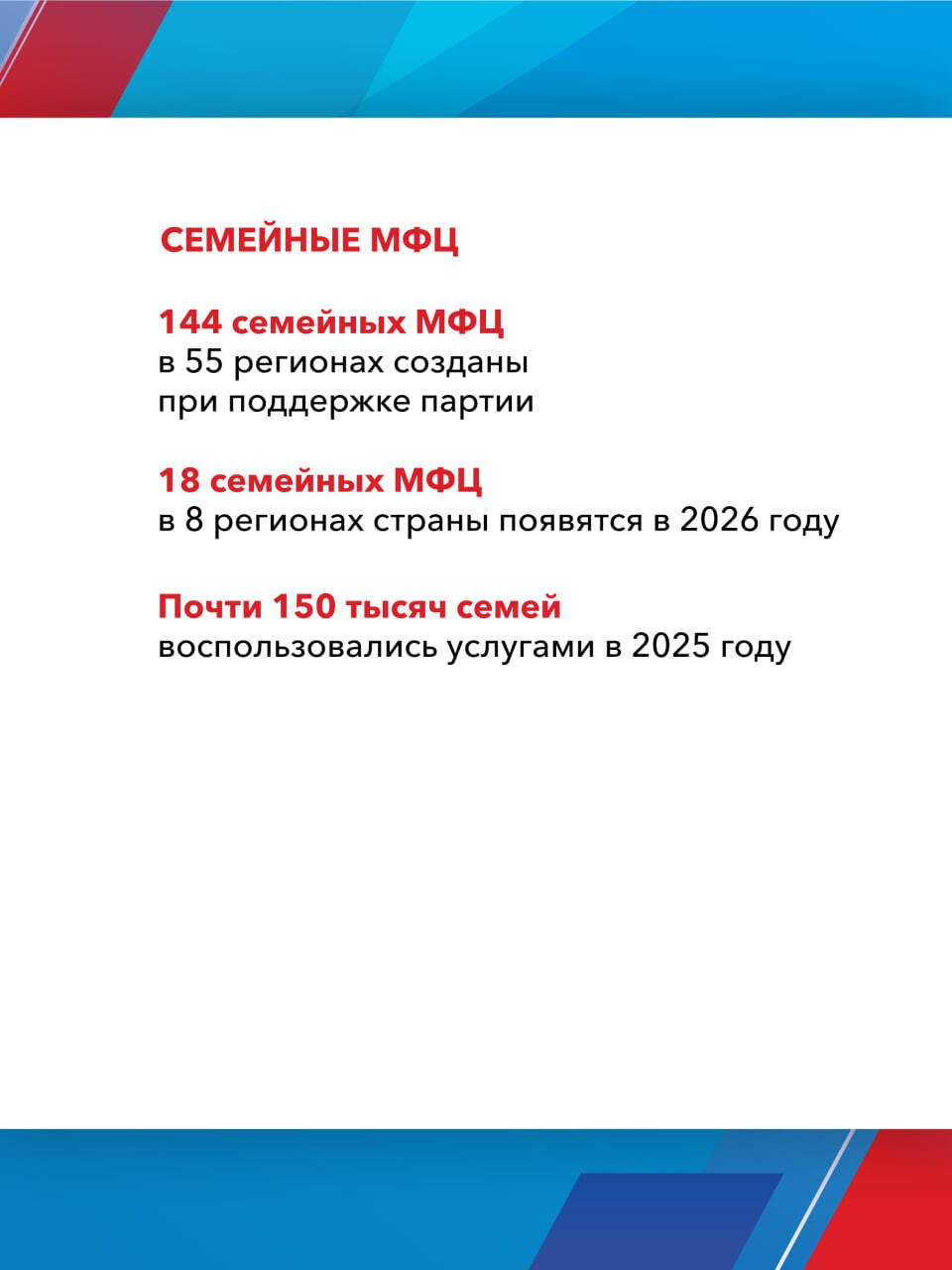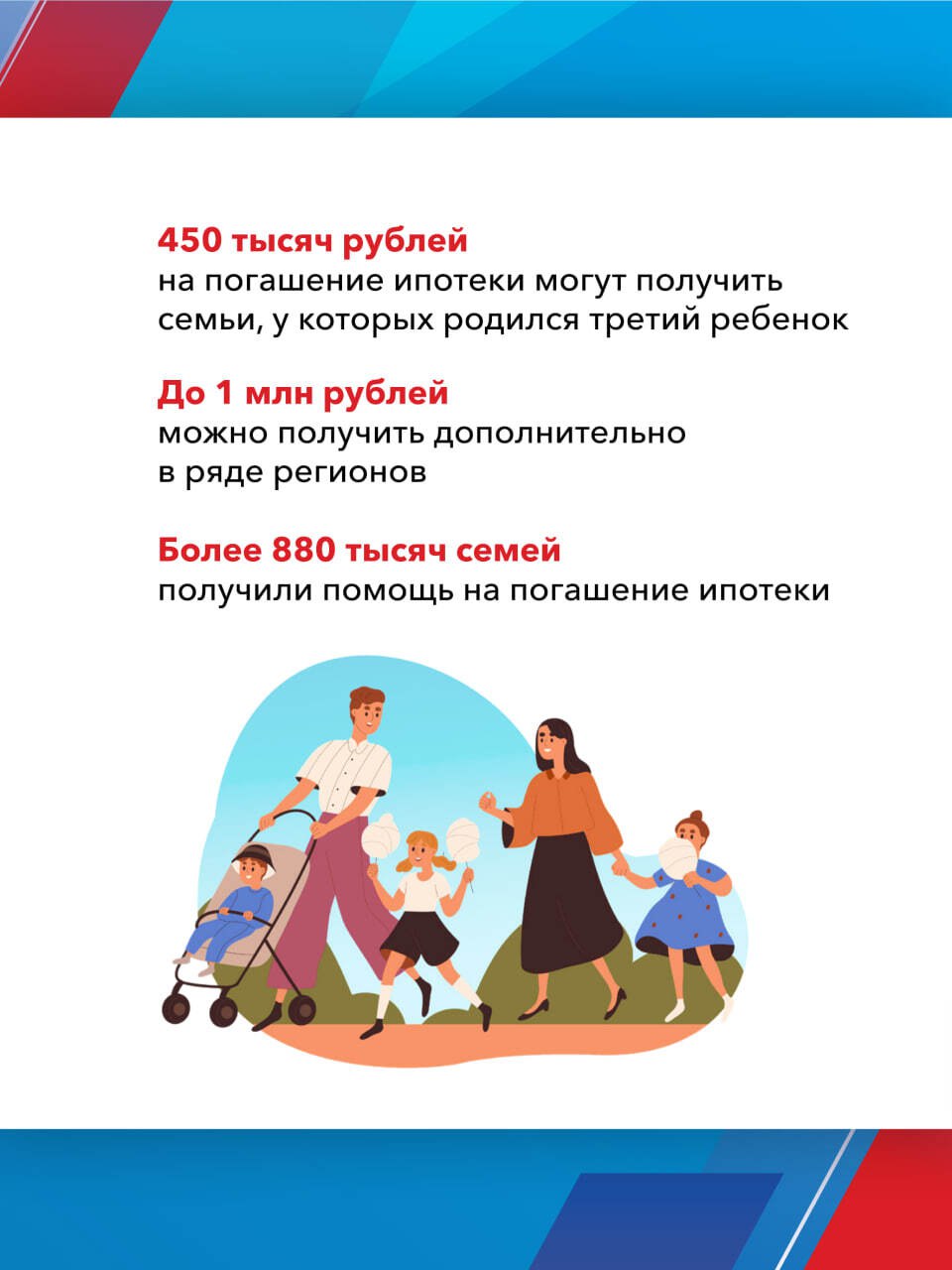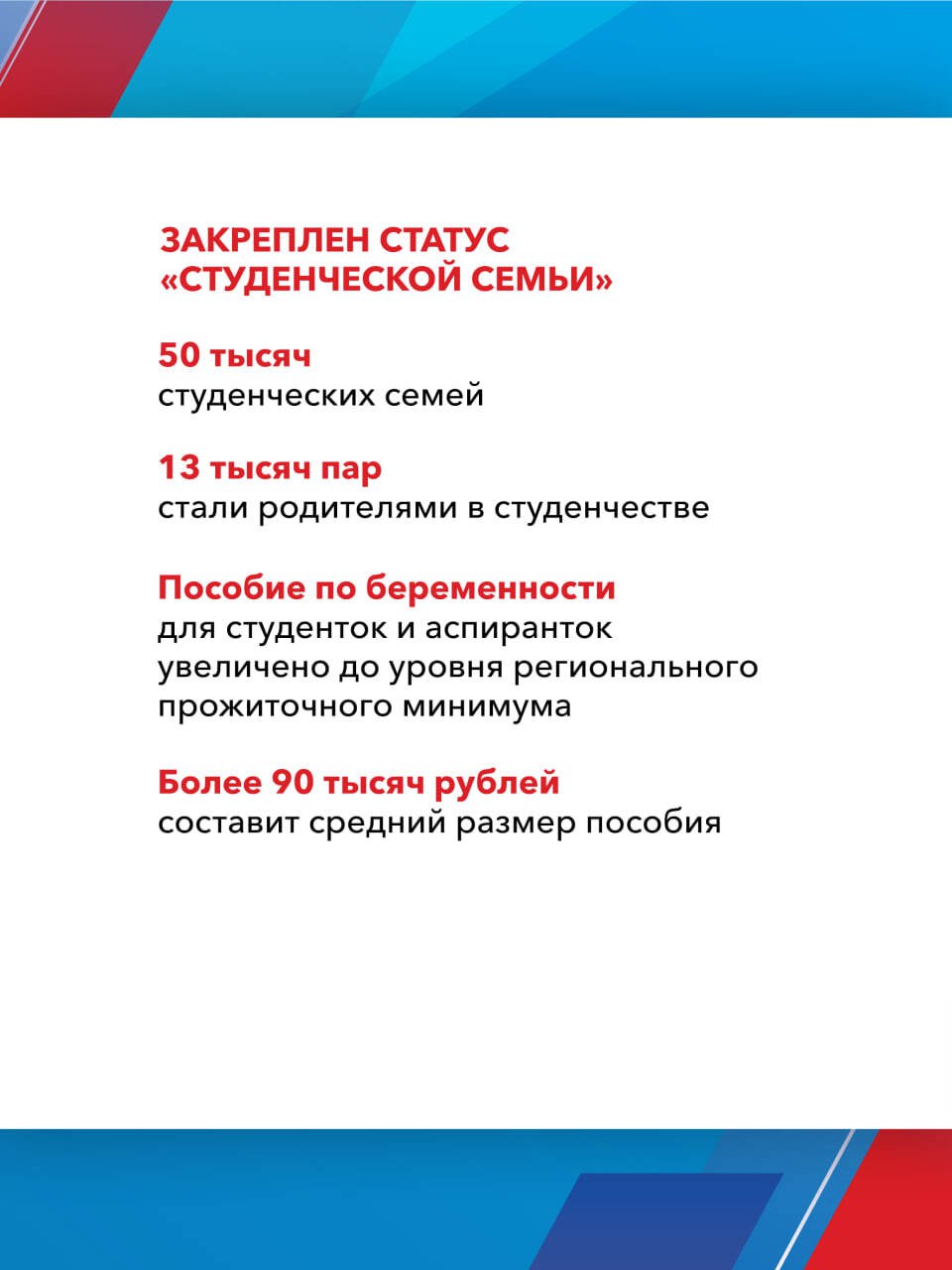 Одной из главных целей реализации Народной программы стала поддержка семей с детьми. Более 15 млн семей уже получили сертификат на материнский капитал, свыше 1,5 млн смогли улучшить жилищные условия благодаря специальной льготной ипотеке. Отдельное внимание уделяется студенческим семьям и детям-сиротам.