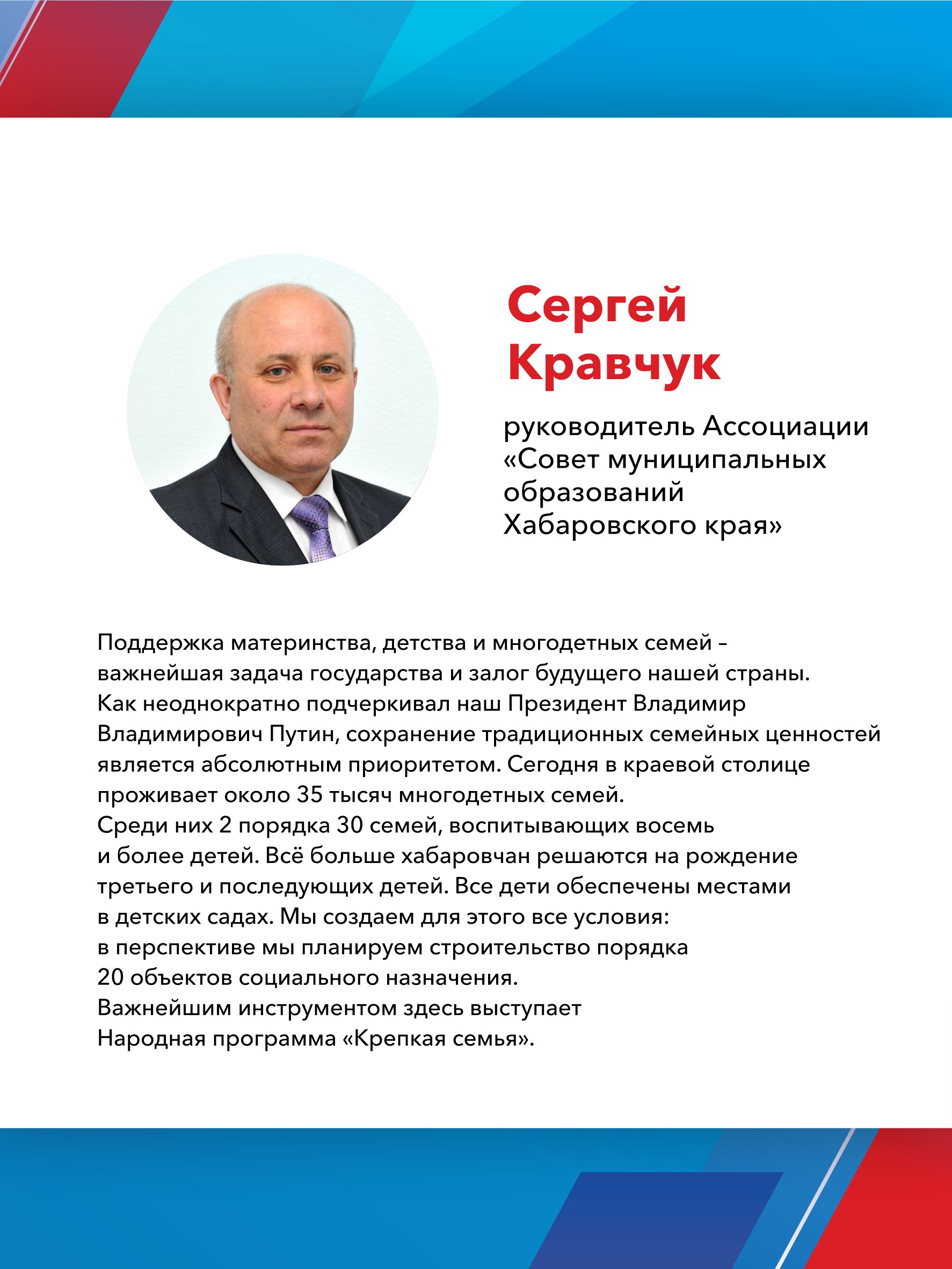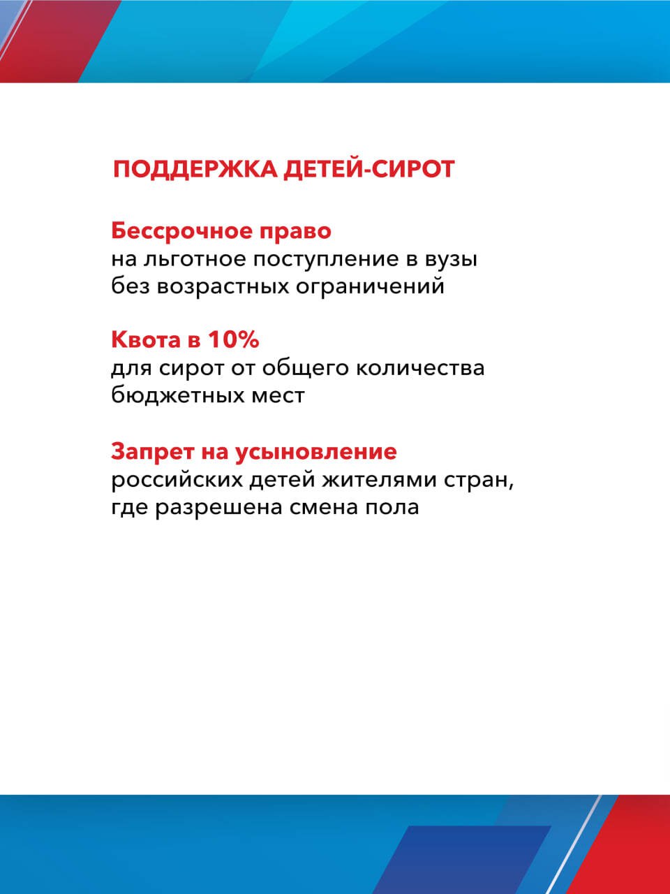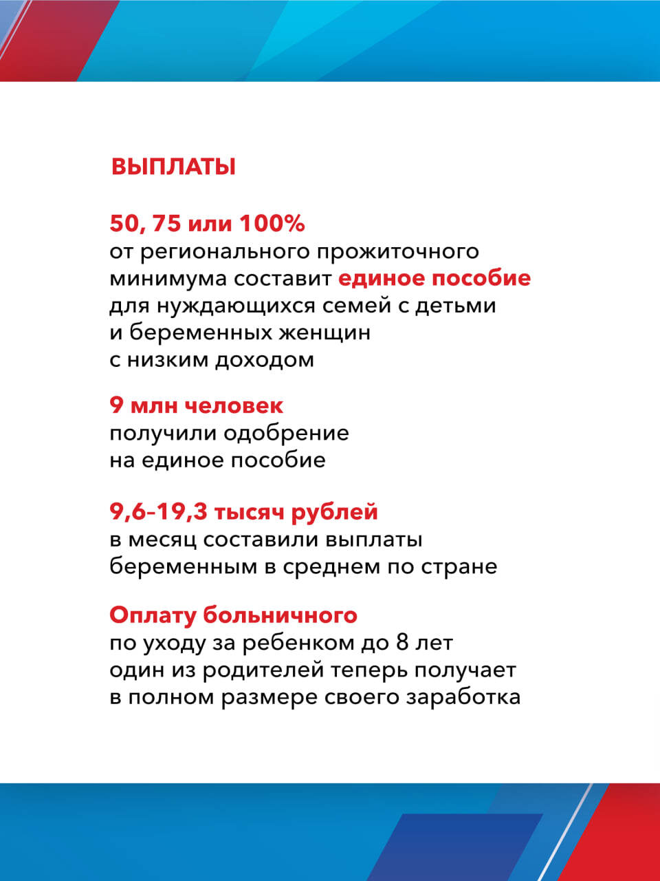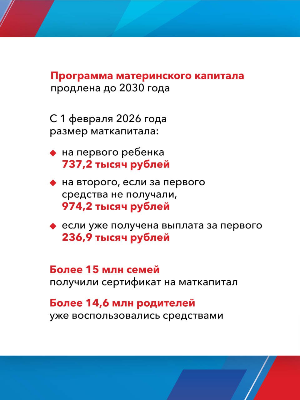 Одной из главных целей реализации Народной программы стала поддержка семей с детьми. Более 15 млн семей уже получили сертификат на материнский капитал, свыше 1,5 млн смогли улучшить жилищные условия благодаря специальной льготной ипотеке. Отдельное внимание уделяется студенческим семьям и детям-сиротам.