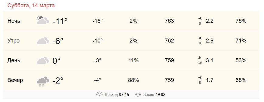 Ветер северо-восточный, около 3 м/с. Пасмурно, вечером снег.