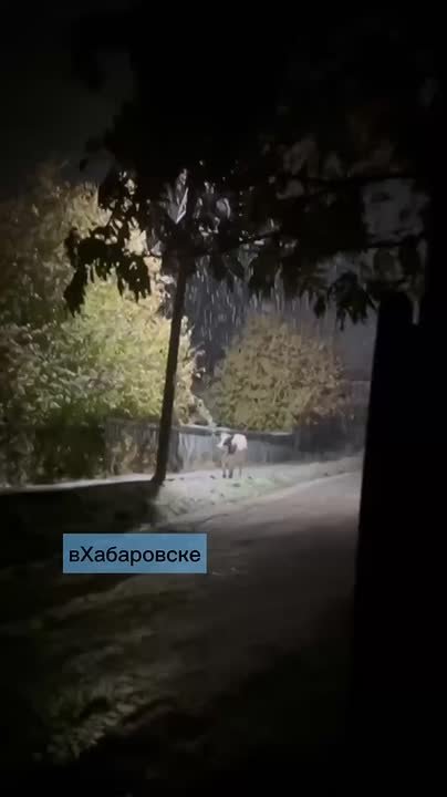 Тёмная улица, освещённая фонарём, и одинокая корова превратили обычный вечер в настоящую поэзию. Не хватает только аптеки.