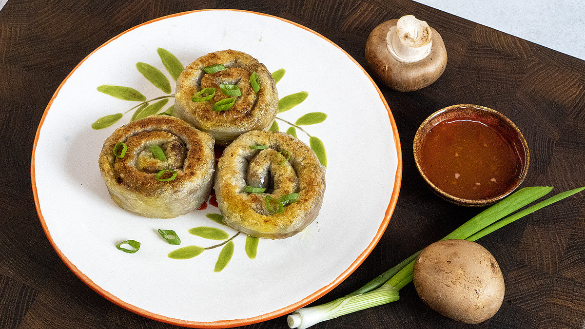 К начинке добавляют нарезанный зеленый лук, немного финикового сиропа для сладости и капли кунжутного масла для аромата. Рисовую бумагу обмакивают в воду, затем выкладывают начинку и сворачивают в форме улитки. Обжаривают на растительном масле с обеих сторон до образованию аппетитной корочки.