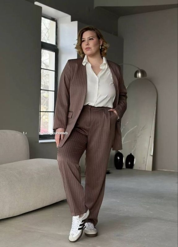 1. Костюм в кофейных тонах: элегантный жакет в сочетании с классическими брюками и белой блузкой создают стильный деловой образ. Свободный крой и вертикальные полоски визуально стройнят силуэт, а удобные кроссовки добавляют комфорта и легкости.