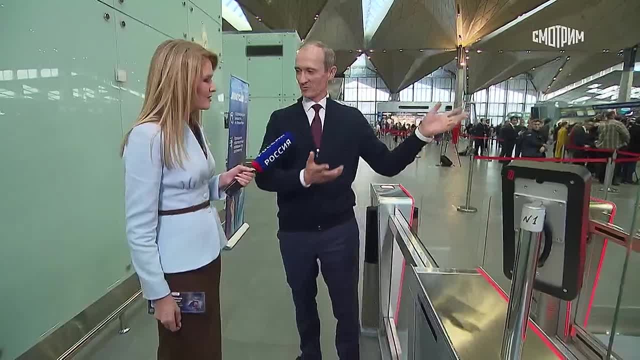 Вице-премьер Дмитрий Григоренко показал корреспонденту «России 1» Марине Громовой, как проходит посадка на самолёт по биометрии – эта система позволит избавить пассажира от необходимости показывать паспорт в аэропорту. Систему в пилотном режиме запустят в следующем году.