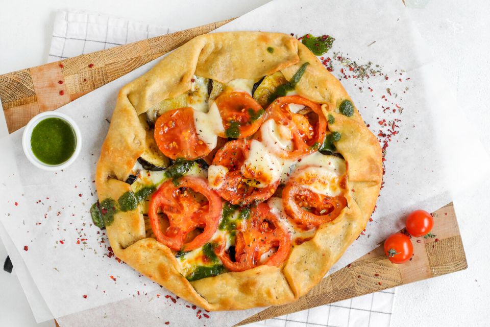 3. Ломтики сыра сулугуни уложите на тесто на расстоянии 4 см от краев и задайте начинку слоями: сначала моцареллу, затем баклажаны и помидоры. Заверните края теста внутрь, образуя эффектные складки. Выпекайте галету в течение 25 минут. Подавайте ее горячей, щедро поливая соусом песто и украшая сушеными томатами и базиликом.