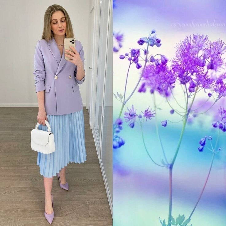 - Лавандовый: Нежный и романтичный цвет похож на цветущие поля Прованса. Он привносит легкость и элегантность, прекрасно сочетаясь с различными стилями — от строгого до casual.