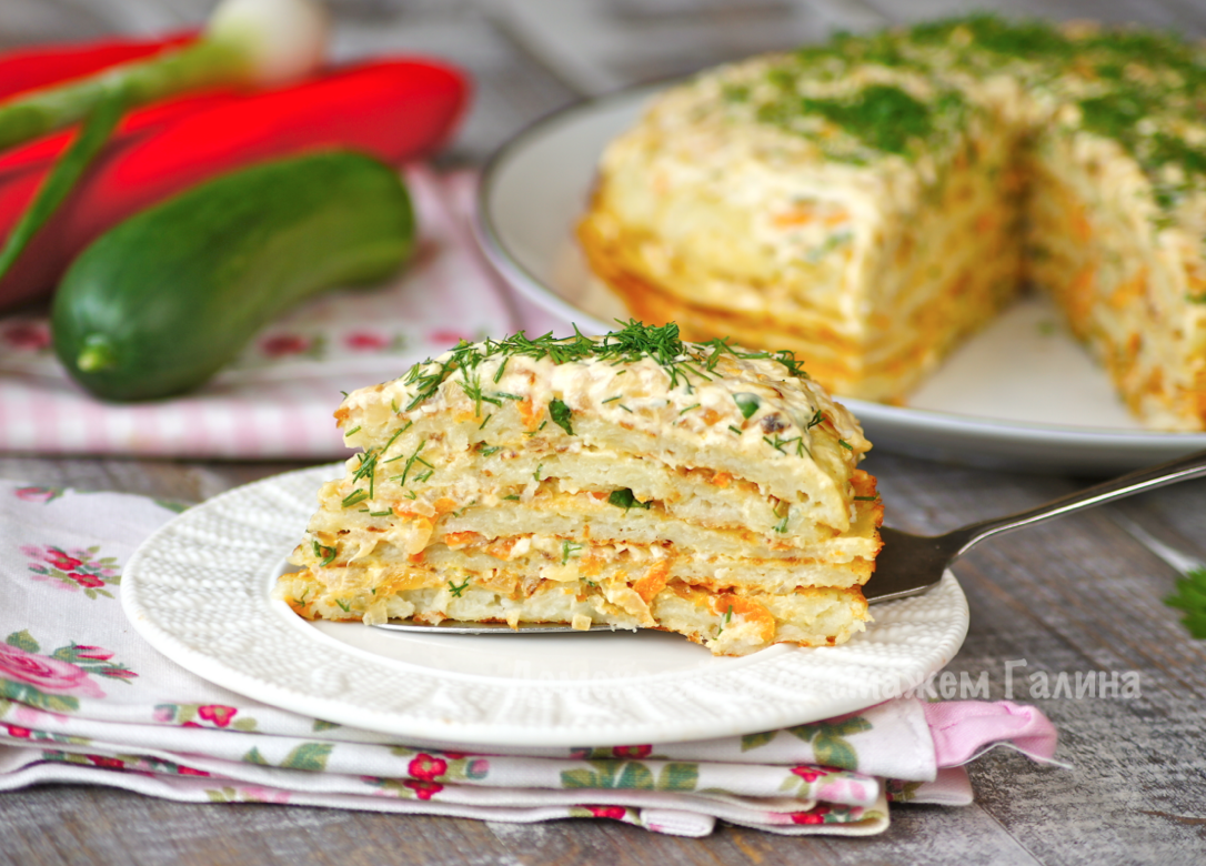 Теперь пришло время собрать торт: каждый картофельный блин обильно смазывается овощной массой, укладываются в аккуратные слои, что не только добавляет вкуса, но и делает его привлекательным на столе. Этот картофельный торт станет прекрасным дополнением к любому семейному обеду или ужину, принося уют и тепло в дом.