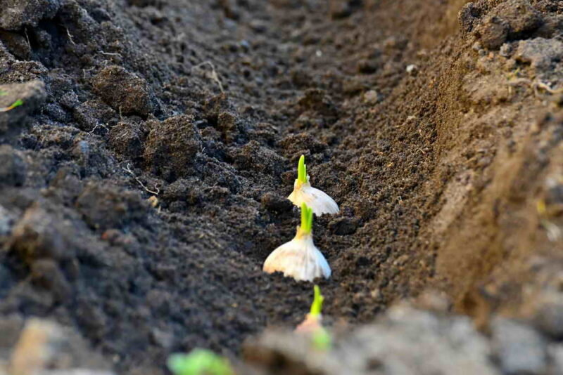 В период первых заморозков можно начинать высадку. Для этого выкапываются лунки, расположенные на расстоянии 10-12 см друг от друга, а глубина варьируется от 3 до 15 см. Дольки помещаются в лунки так, чтобы не создавать чрезмерного давления, и на них укладывается смесь перегноя с компостом. Завершающим этапом становится мульчирование — это поможет сохранить влагу и защитить посадки от морозов.