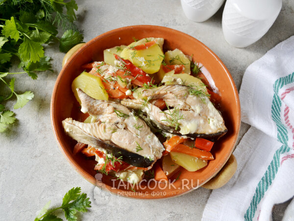 3. Рыбу нарежьте на куски, посолите и разместите на овощах. В отдельной ёмкости смешайте тёплую воду с майонезом, перемешайте и равномерно влейте на рыбу с овощами.