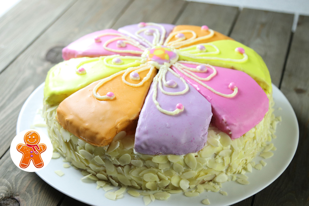 Торт покрывают глазурью, делая его не только вкусным, но и поистине красивым. Остались только небольшие детали: украшения из миндальных лепестков и финальные штрихи кремом, чтобы придать готовому десерту завершенность.