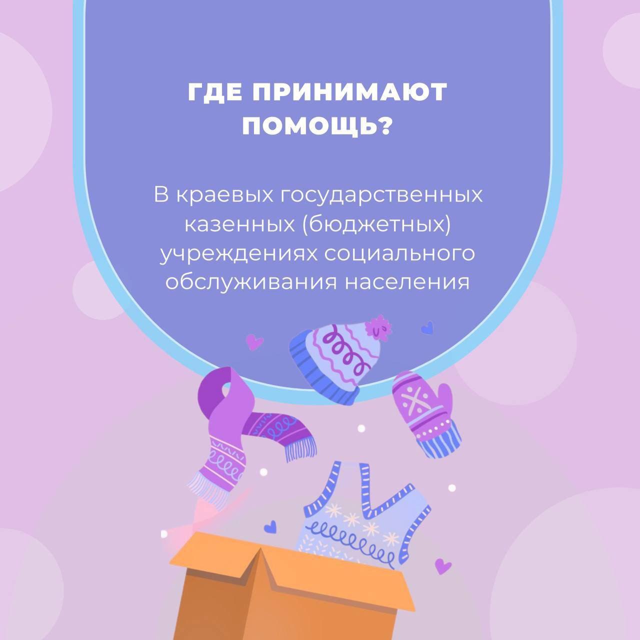 Акция продлится до 30 ноября. Принимают вещи во всех краевых государственных казенных (бюджетных) учреждениях социального обслуживания населения. Подробности по телефонам: (4212) 32-62-49, 31-13-59.