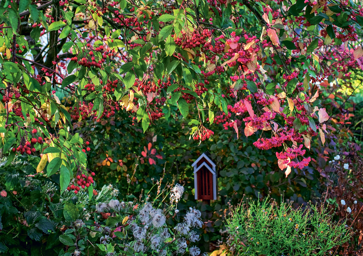 Плоды рябины, калины, аронии и других ярких кустарников делают сад поистине сказочным. Эти растения наряжаются в золотые и красные лиственные одеяния, в то время как их плоды, словно бусинки, украшают ветви. Плоды декоративной яблони, например, остаются на своем месте долго, и отлично подходят для создания осенних композиций.