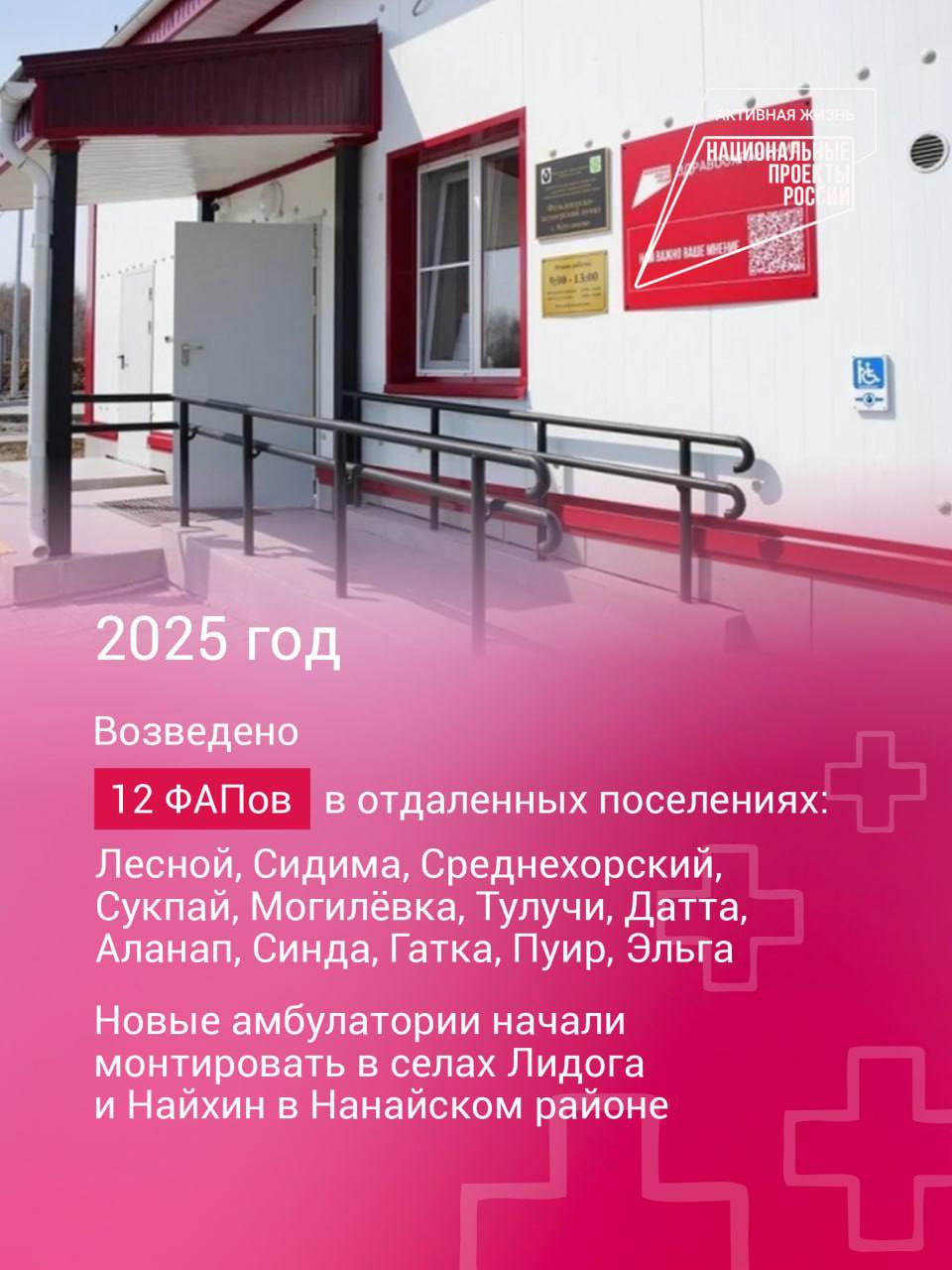На данный момент полностью смонтированы ФАПы в поселках Лесном, Сидима, Среднехорском, Сукпай, а также в селах Могилевка, Тулучи, Датта, Аланап, Синда, Гатка, Пуир и Эльга.