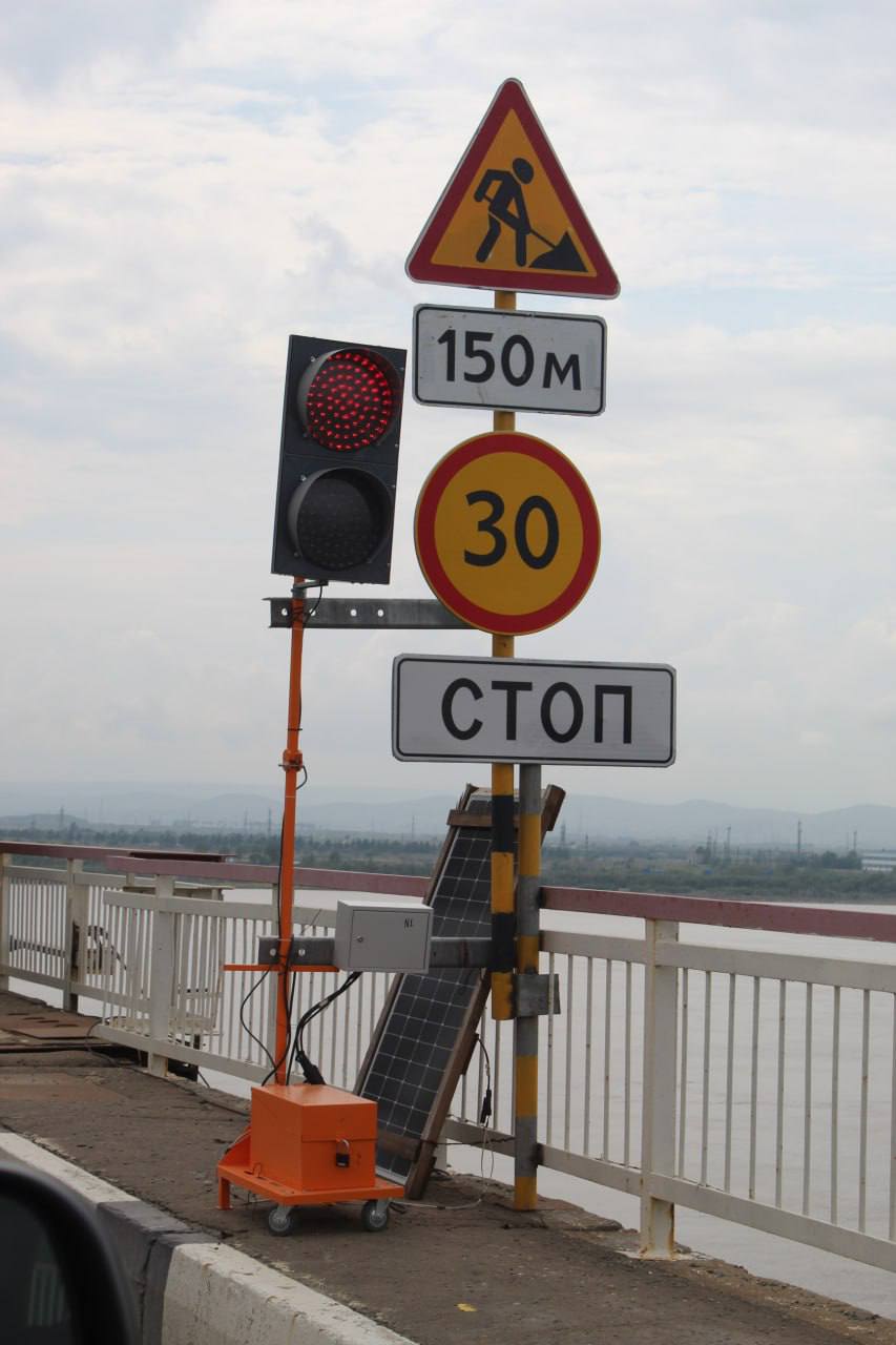 Капитальный ремонт моста через реку Амур вблизи г. Комсомольска-на-Амуре продолжается, в связи с чем, введено реверсивное движение, очередность движения транспортных средств на данном участке регулируется светофором