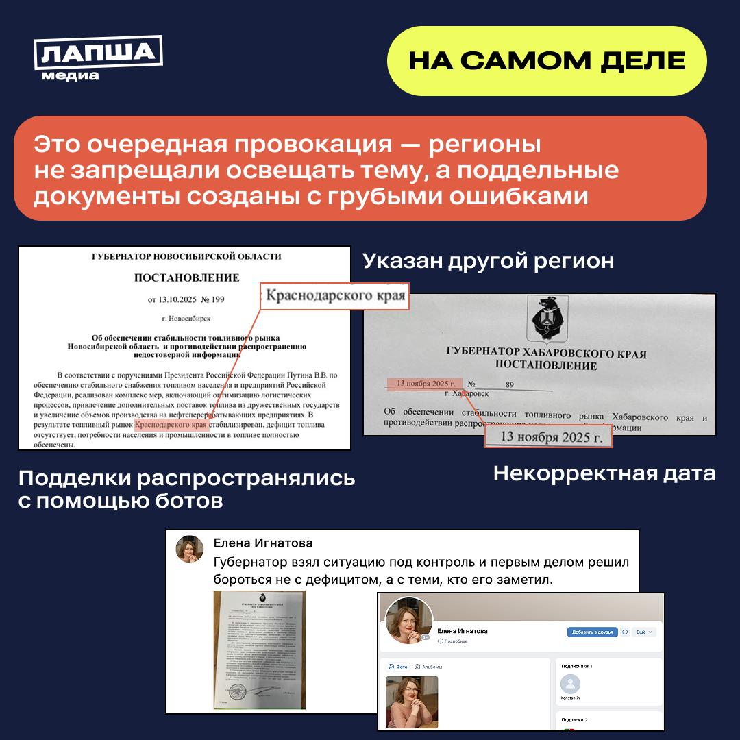 ЦУР Северная Осетия-Алания назвал распоряжение о запрете комментировать дефицит топлива «подделкой». Представитель администрации губернатора Новосибирской области также сообщил, что такого постановления не существует: «Документ — фейк, причем очень плохо сделанный, даже упоминания Краснодарского края не убрали».