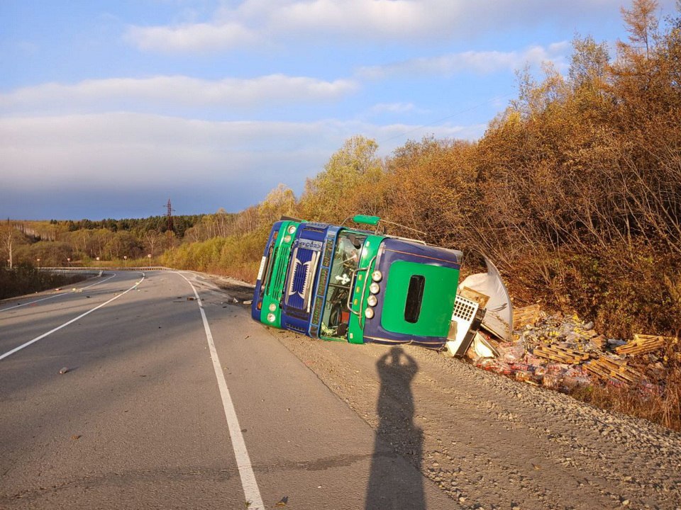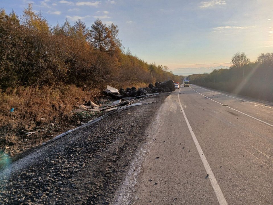 Авария произошла накануне на трассы «Хабаровск-Лидога-Ванино» недалеко от Ванино. Большегруз, нагруженный пивом, ехал по обочине, но не удержался и опрокинулся в кювет.