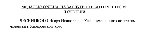 Также высокой награды — медали ордена «За заслуги перед Отечеством» II степени — удостоен уполномоченный по правам человека в Хабаровском крае Игорь Чесницкий. Указ подписан главой государства Владимиром Путиным 15 октября 2025 года.