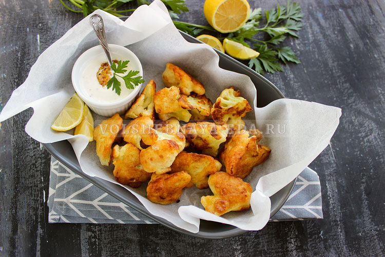 - Классический вариант: Для базового рецепта понадобятся соцветия цветной капусты, яйца, мука и растительное масло. Отваренные до готовности соцветия обваливаются в кляре и обжариваются до золотистой корочки.