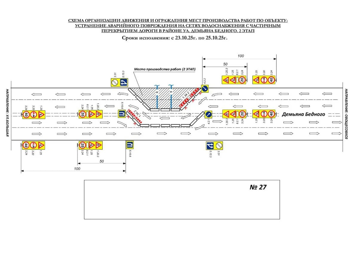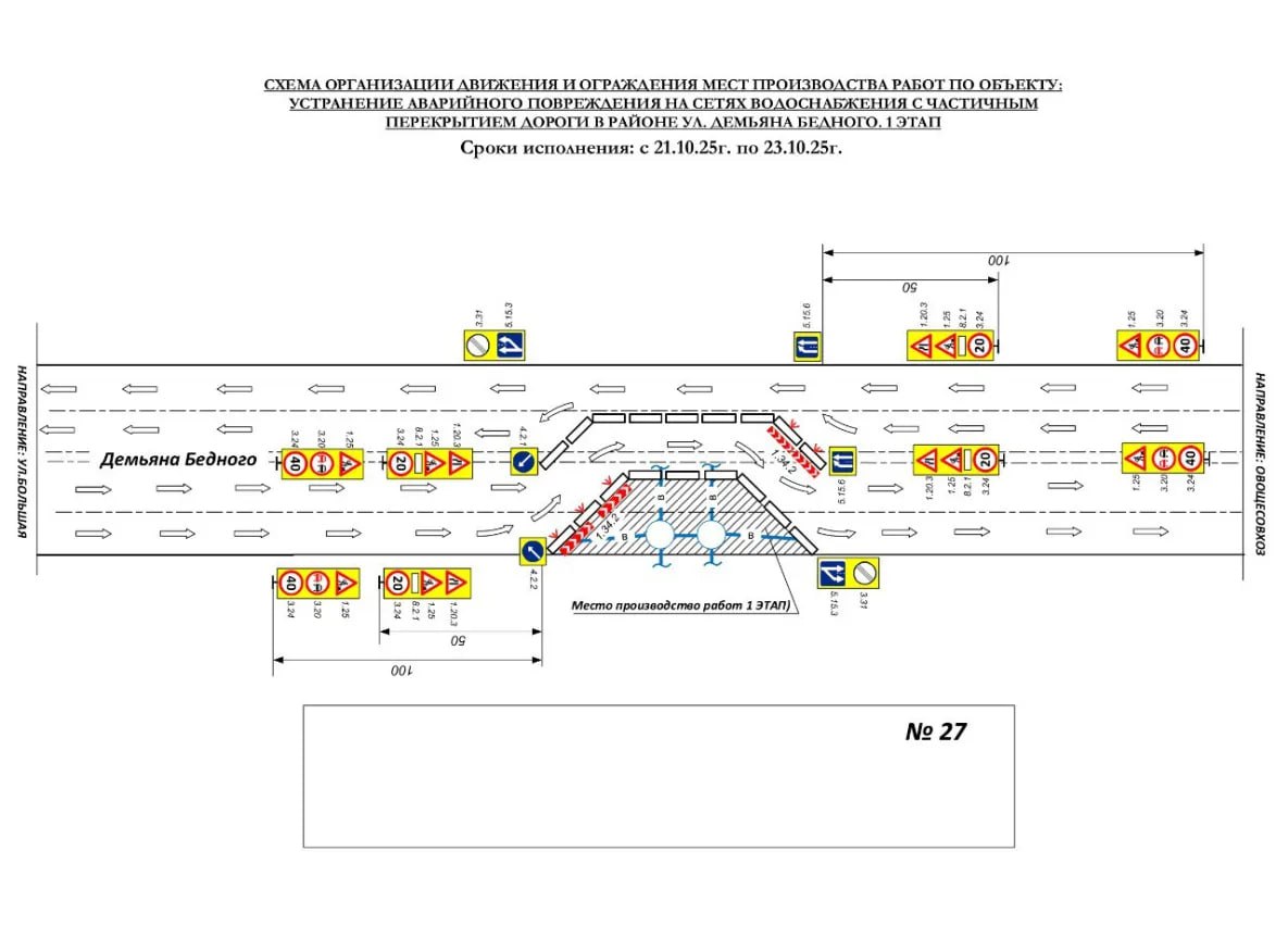 Ограничение дорожного движения запланировано с 21 по 25 октября. На участке дороги по ул. Демьяна Бедного в районе домов №№23 – 29 временно ширина дороги составит одну полосу на участке в 10 метров.