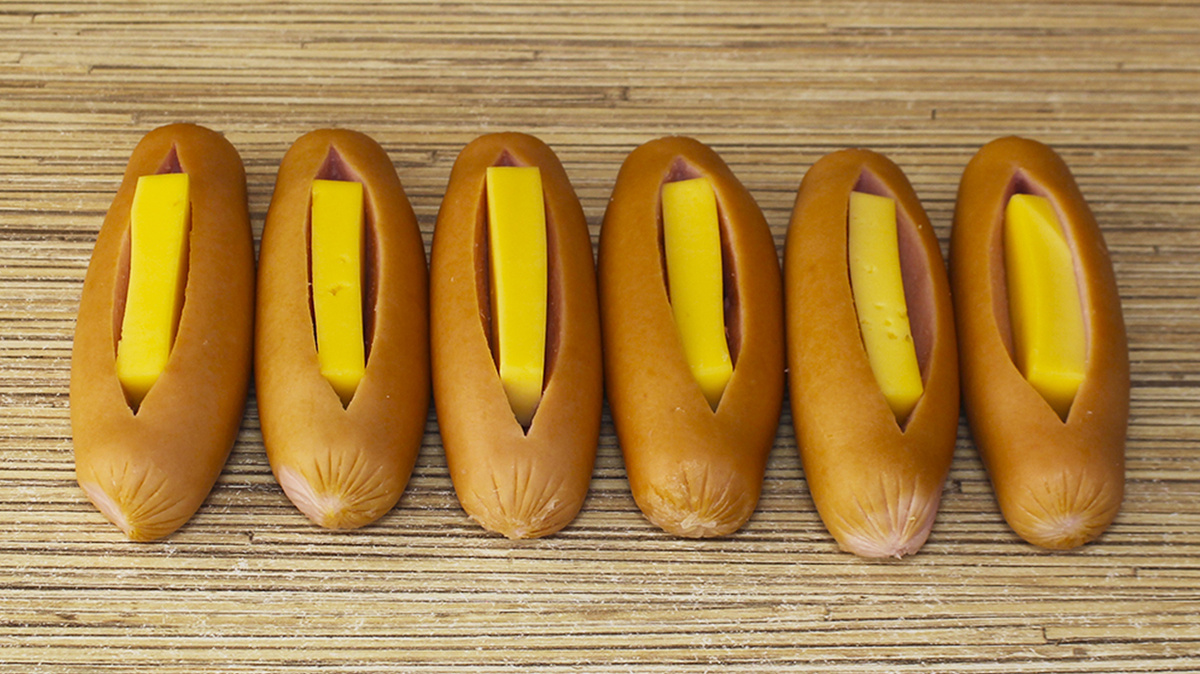 Для начала нужно подготовить сосиски. Каждую сосиску следует сделать глубокий продольный разрез, оставляя небольшие края — так получится «кармашек» для сыра. После этого нарезается твердый сыр на брусочки, которые удобно помещаются в сосиски.