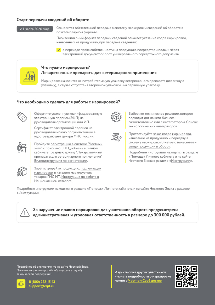 С 1 марта 2025 года на территории РФ вступили требования о передаче в информационную систему маркировки сведений о розничной продаже ветеринарных препаратов.