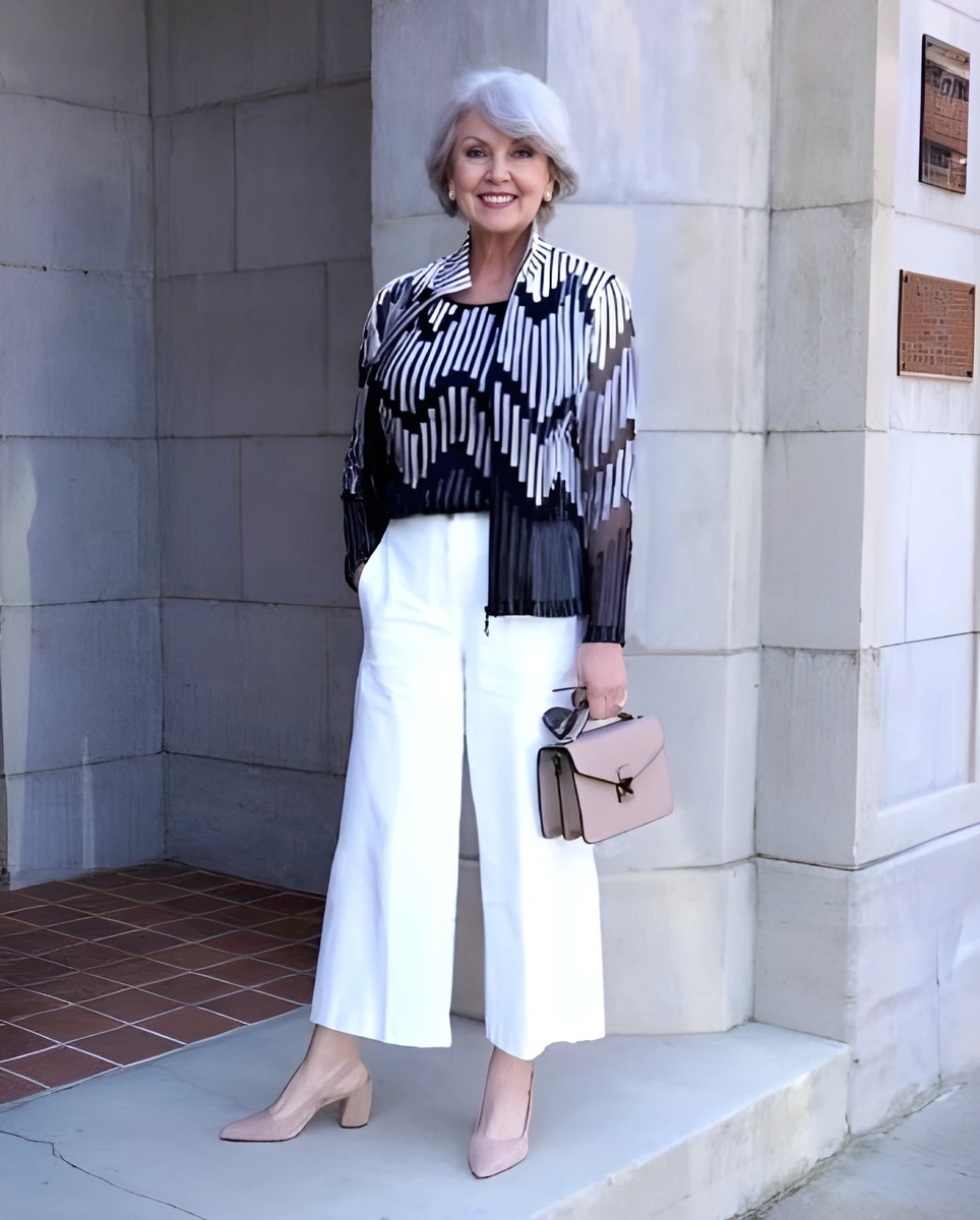 - Светлые брюки и контрастный верх: Можно комбинировать широкие белоснежные брюки до щиколотки с темным верхом в черно-серо-белом принте. Заправленная блузка акцентирует внимание на талии, а полупрозрачная рубашка визуально скрывает возрастные изменения в области шеи и рук.