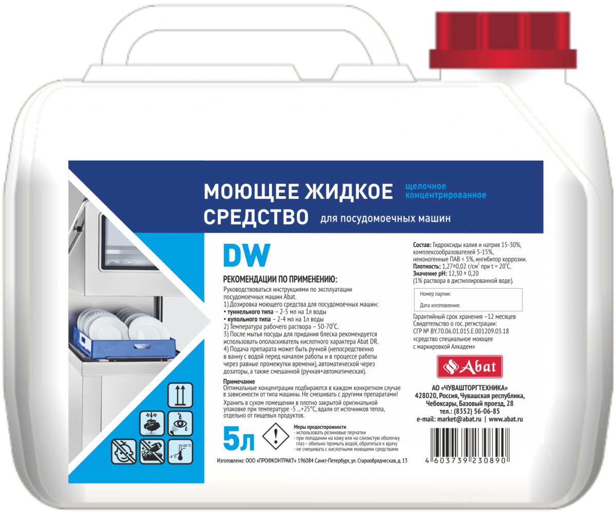 Abat DW — это универсальное средство для ежедневной работы с посудомоечными машинами. Оно эффективно удаляет жир, остатки пищи и белковые отложения. Рекомендуемая концентрация составляет 2-5 мл на литр воды. Оптимальная температура для работы — 50-70°C, что позволяет избежать повреждений тонкостенного стекла и стальной посуды.